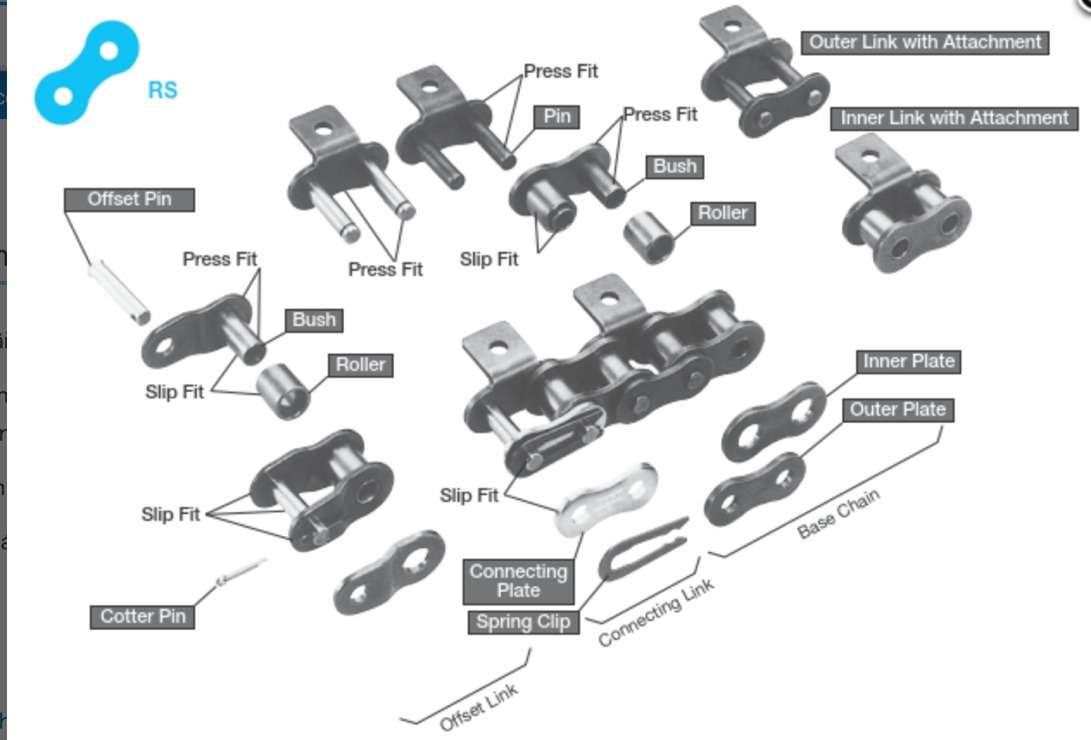 Các thành phần cơ bản của xích con lăn BS có tay gá