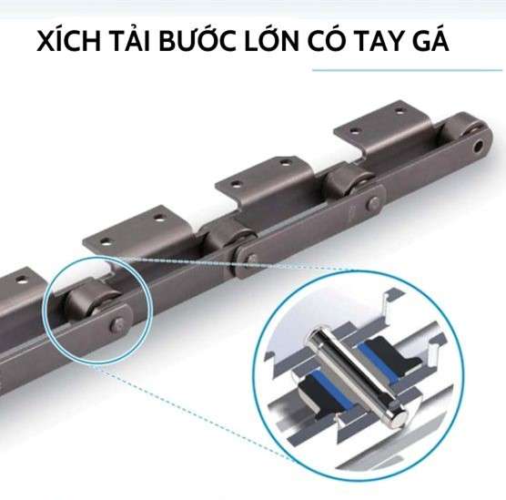 Xích băng tải có tay gá được thiết kế với các tay gá nhỏ nằm trên mặt băng tải, giúp giữ chặt hàng hóa và ngăn chúng trượt xuống, đảm bảo an toàn trong quá trình vận chuyển. Xích băng tải có tay gá có thể được điều chỉnh để phù hợp với kích thước và trọng lượng của hàng hóa khác nhau.