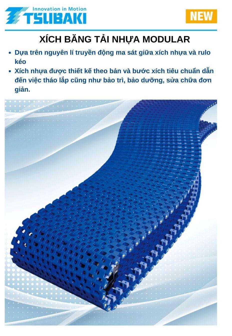 Xích băng tải nhựa MODULAR được thiết kế đơn giản, dễ tháo lắp, bảo dưỡng, kết cấu khung chủ yếu dùng inox dẫn đến độ vững chắc cao, phù hợp trong môi trường cần vệ sinh bằng nước liên tục. Với các đặc điểm chống ăn mòn, ít trầy xước, dẫn đến không có vi sinh vật, đảm bảo được an toàn khi sử dụng trong ngành thực phẩm. Có thể lựa chọn các loại xích như "closed type", "open type", "net type", "flight type", "rubber type" and "magnet type" tùy theo ứng dụng và hình dạng của vật liệu được vận chuyển.